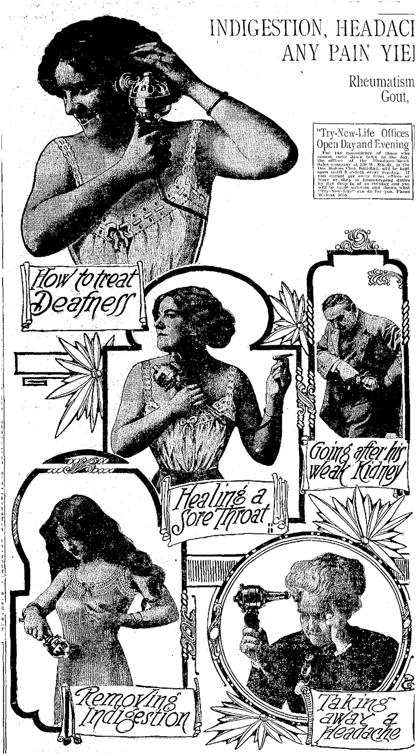 ඒ කාලේ 'Vibrator' එක "panacea" (සර්ව රෝග නිවාරණ) යන්ත්රයක් විදිහට තමයි market කළේ. නින්ද නොයාම, අංශභාගය, බිහිරි බව, රක්තවාතය, මලබද්ධය, වමනය, අර්ශස් (insomnia, paralysis, deafness, gout, constipation, vomiting, haemorrhoids) වගේ ලෙඩ 65කටත් වඩා හොඳ කරන්න මේක පාවිච්චි කරන්න පුළුවන් කියලා ඒ දවස්වල දැන්වීම්වල ගියා.